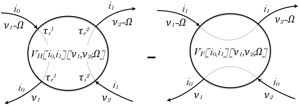 \begin{eqnarray} V_H[i_0,i_1][\nu_1,\nu_2;\Omega] = M_{i_0}(\nu_1,\nu_1-\Omega)\; M_{i_1}(\nu_2-\Omega,\nu_2)\\ V_F[i_0,i_1][\nu_1,\nu_2;\Omega] = M_{i_0}(\nu_1,\nu_2) \; M_{i_1}(\nu_2-\Omega,\nu_1-\Omega) \end{eqnarray}The two particle Green's function then can be constructed by: